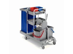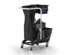 Carrello multiuso composto da base piccola con ruote DIAMETRO 100 mm. E paracolpi, un montante in rilsan, due cassette, due secchi 6 lt., un portasacco 120 lt. E un gancio portamanico flip.