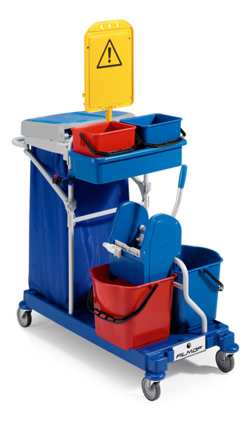 Carrello multiuso "morgan" composto da base grande con ruote DIAMETRO mm.100 e paracolpi, montante in rilsan, cassetta esterna, 2 secchi lt. 6, portasacco 120 lt., portastrizzatore in rilsan, strizzatore regular, 2 secchi lt. 15, gancio portamanico flip