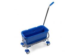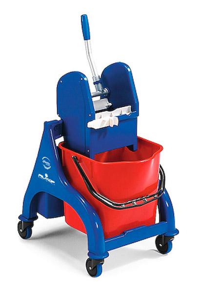 Carrello ORION certificato "PLASTICASECONDAVITA" (PSV) da lt. 25 composto da telaio con ruote Ø 80 mm e paracolpi, strizzatore Regular e secchio. Carrello utilizzato per il lavaggio pavimenti di ambienti medio/piccoli.