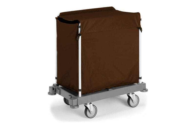 Carrello portabiancheria composto da base piccola con ruote ø 125 mm, 2 montanti in Rilsan e sacco in tela con zip e cappuccio. Carrello di servizio per la raccolta della biancheria sporca negli hotel, nelle collettività e nelle comunità.