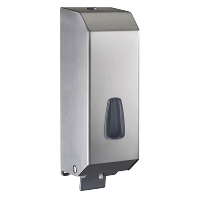 Dispenser in acciaio inox per sapone liquido a rabbocco. Montaggio a muro con tasselli. Chiusura con serratura a chiave.