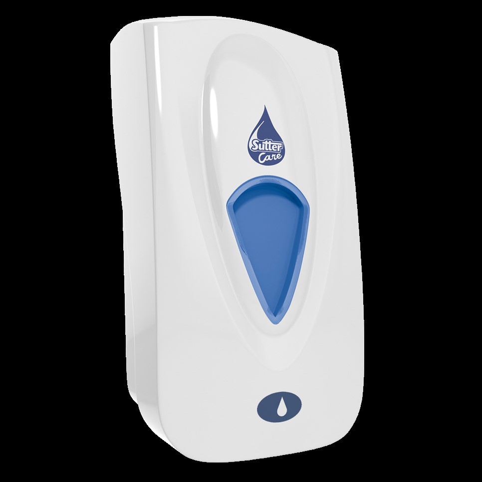 Dispenser personalizzato "Sutter Care" per i prodotti lavamani e saponi in crema ANTIBAC CREAM 5 L e LOTION CREAM 5 L. Dispenser a riempimento con capacità di 900 ml e con finestra colorata azzurra, utile anche per controllare il livello di prodotto. Erogazione: 1 ml/dose.