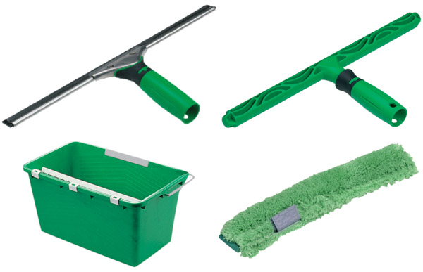 Kit per lavaggio di tutti i vetri interni ed esterni, composto da secchio graduato da 18 litri completo di strizzatore e porta tergivetro, tergivetro Ergotec, vello Ergotec in microfibra.