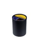 Struttura in metallo verniciato nero; tre secchi colorati ed estraibili in polipropilene (6 L + 2 x 3 L); ghiera superiore rimovibile; coperchio divisorio con sportelli impressi