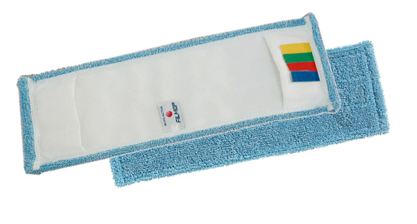 Panno mop in microfibra con tasche, con etichetta colour-code. Utilizzato con il telaio cod. 3FM291/3 per lo spolvero, il lavaggio, la ceratura e la disinfezione di pavimenti lisci interni (hotel, case, uffici, ospedali, ecc) con grado di sporco medio-bas