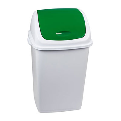 Polipropilene ad alta densità; coperchio basculante, utile come fermasacco; versione 50 lt disponibile in vari colori per raccolta differenziata; stabile e di facile manutenzione; supportomurale in metallo in opzione. Misure 420x330x680