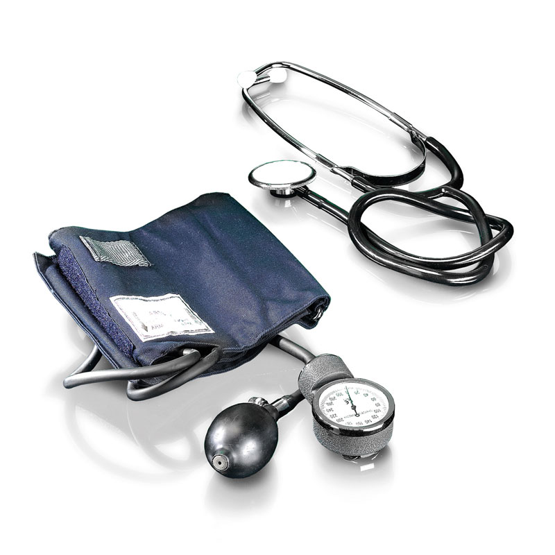 Sfigmomanometro ad aneroide con manometro in lega leggera cromata. Bracciale in tessuto lavabile con chiusura in velcro. Monopalla in lattice con valvola. Pezzo singolo con custodia. Fonendoscopio ultrapiatto con testa in allumino anodizzato.
