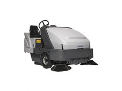 Spazzatrice a batteria con uomo a bordo. Ampia pista centrale da mm.900. Pista di pulizia con spazzola laterale destra mm.1250. Pista di pulizia con 2 spazzole laterali mm.1600, fornita di serie completa di filtro a pannello, spazzola centrale e laterale destra in PPL, gomme superelastiche, lampeggiante e bracciolo