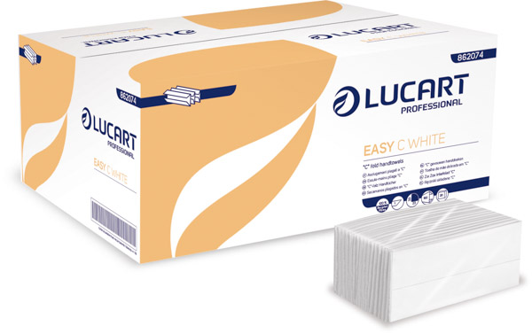 Asciugamani piegati, in carta rigenerata, macro goffrati. Per l'area bagno e clientela esigente. Compatibili con dispenser Helix Lucart 892314