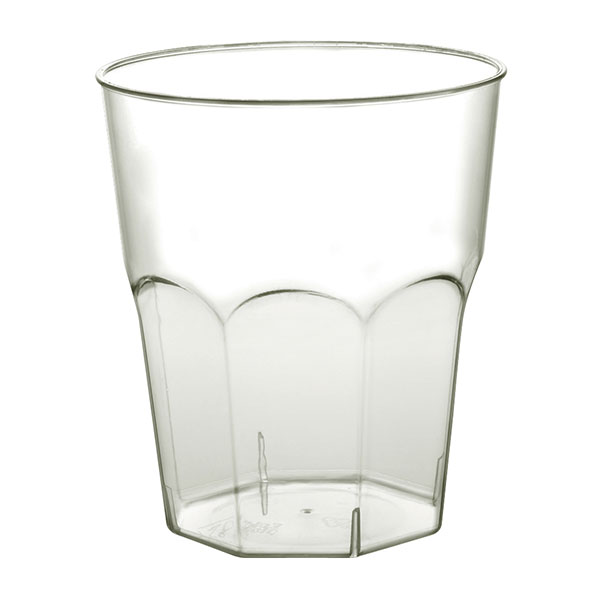 Bicchiere ottegonale riutilizzabile per cocktail in polistirene trasparente.