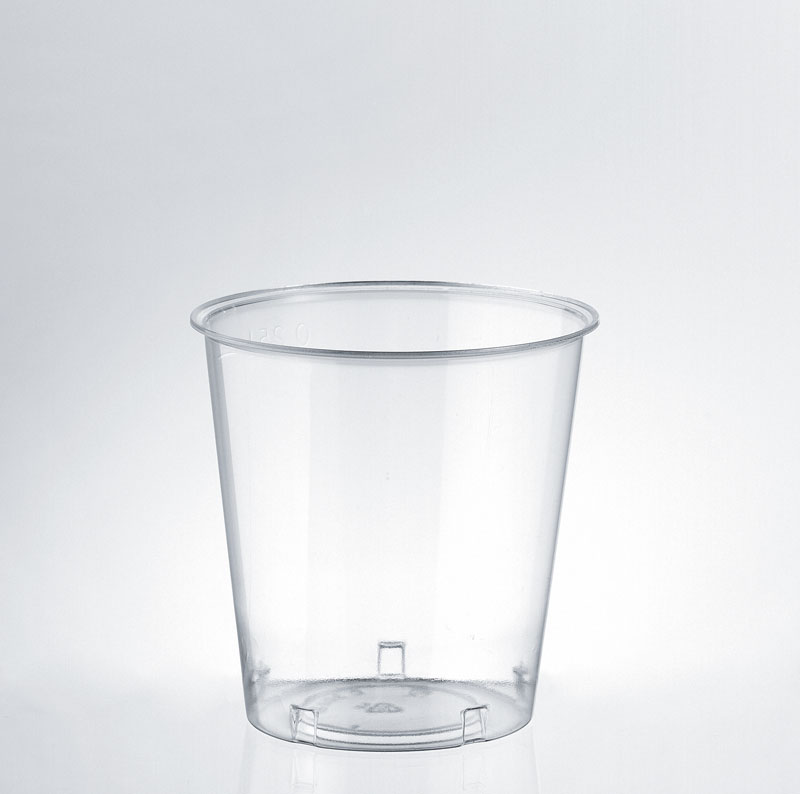 Bicchiere conico in polistirolo effetto cristallo trasparente. Per bevande calde e fredde, temperatura massima di utilizzo 70°C. Tacca a 250 cc.
