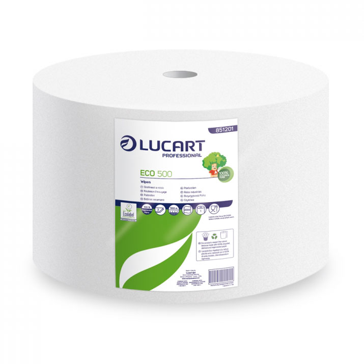 Bobina industriale in carta rigenerata, 2000 strappi, 2 veli, goffratura microleggera, adatta ad ambienti di lavoro a contatto con alimenti.