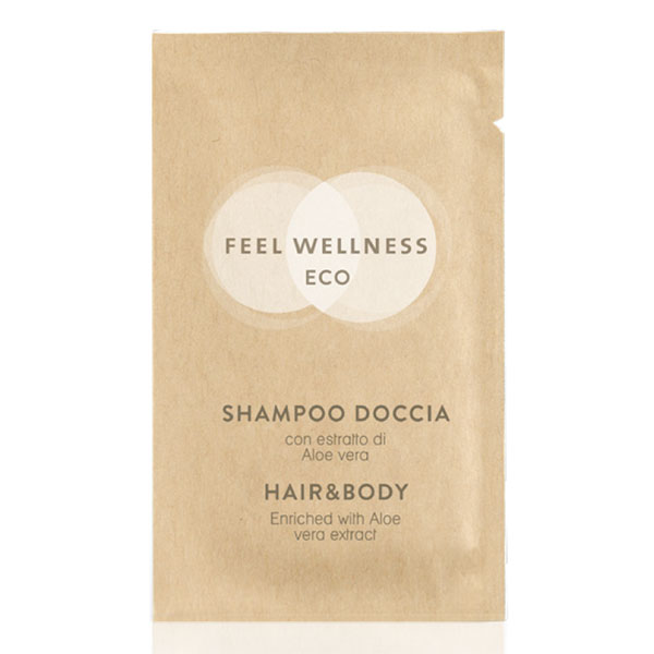 Shampoo doccia all'estratto di aloe vera in flowpack in carta riciclata. Questi cosmetici sono clinicamente testati, senza colori sintetici e testati per il nickel. La gamma Fell Wellness ECO è caratterizzata da un design pulito ed elegante.