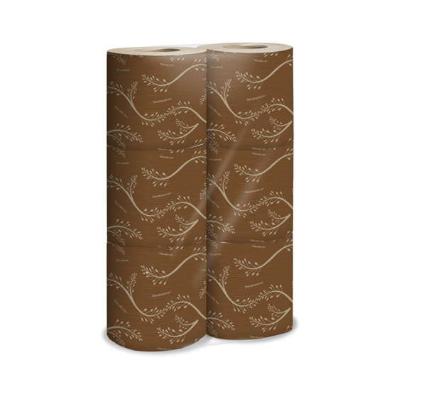 Carta igienica monofascettata, certificata Ecolabel, in carta rigenerata, micro goffrata, decoro floreale, dimensioni strappo lunghezza cm.11 altezza cm.9,5, in fiberpack, lunghezza rotolo mt. 18,7 , 12 sottoconfezioni da 6 rotoli.
