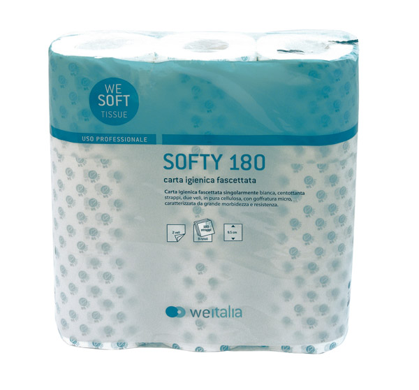 Carta igienica in rotoli microgoffrata in pura cellulosa 2 veli. Fascettata singolarmente. Servizio mm.115x95, rotoli da 180 strappi.