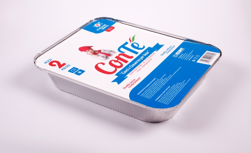 Vaschette in alluminio a bordo L con coperchio in cartoncino+PET per alimenti caldi o freddi. Utilizzabile in forno tradizionale fino a 350°. Utilizzabile in congelatore. Mm.320X260X50