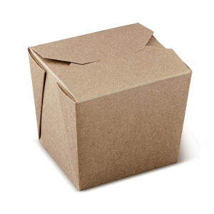 Contenitore da asporto in cartoncino kraft con laminazione interna in PE. Ampia apertura, chiusura a incastro, adatto ad alimenti grassi e/o umidi.