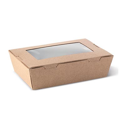 Scatole in cartoncino avana kraft, con finestra trasparente in PE. La laminazione interna in PE le rende adatte anche all'asporto di alimenti grassi e umidi. Per alimenti caldi o freddi. Riempimento facilitato dall'ampia apertura. Montaggio a incastro.