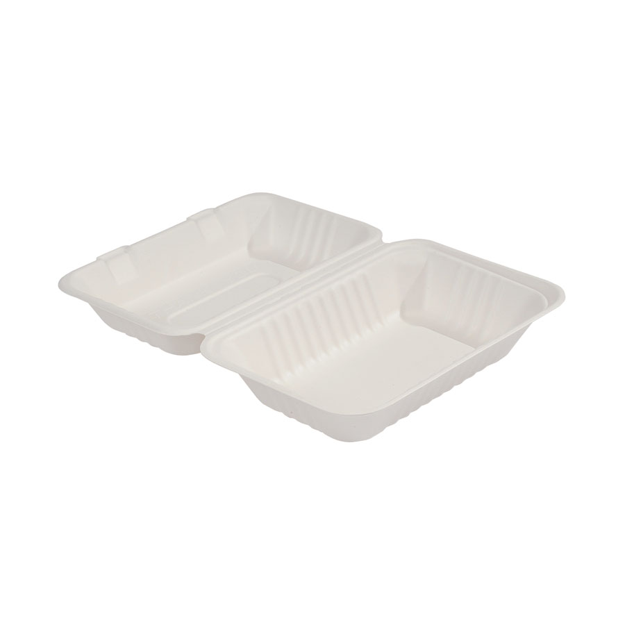 Contenitori da asporto in polpa di cellulosa con coperchio incernierato. Rigidi e resistenti. Completamente compostabili. Adatti ad alimenti caldi e freddi, idonei all'utilizzo nel forno a microonde.