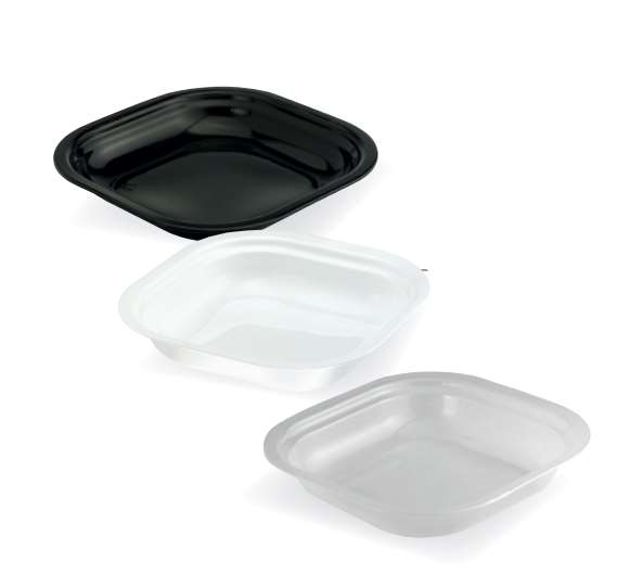 Contenitore fondo quadro bianco in polipropilene, termosaldabile, ottima resistenza e massima capacita'. Utilizzabile in congelatore e in microonde fino a circa 120 °C. GR.11,4. Capacità cc.650