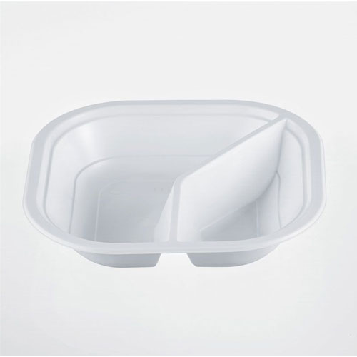 Contenitore biscomparto termosaldabile in polipropilene bianco. Utilizzabile in forno a microonde.