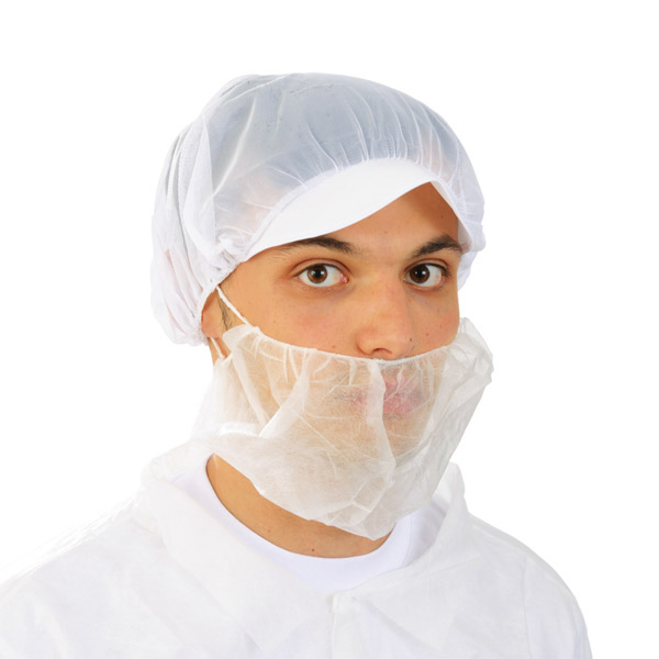 Copribarba e baffi in tessuto non tessuto di polipropilene a giro testa. Colore bianco.