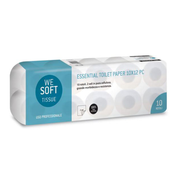 Carta igienica 2 veli in pura cellulosa bianca microgoffrata, morbida e resistente, 12 confezioni da 10 rotoli. 155 strappi mm.93x112, lunghezza rotolo mt.17.