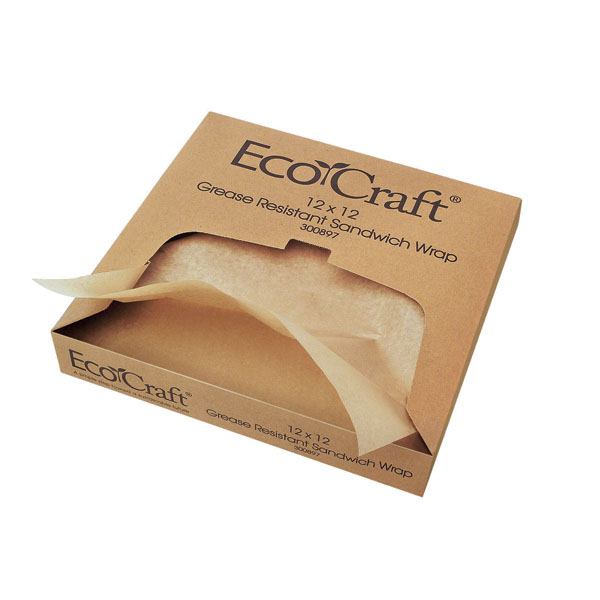 Fogli antigrasso in carta, colore kraft. Scatola realizzata con 100% fibre riciclate. Resistenti ai grassi ma al contempo traspiranti. Ideali per avvolgere cibo o come coprivassoio.