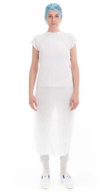 Grembiuli in tessuto non tessuto di polipropilene (TNT). Con pettorina e lacci in vita, colore bianco.