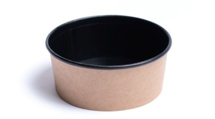 Insalatiera in cartoncino avana con interno nero. Laminata PE. Può essere abbinata al coperchio in PET trasparente. Confezionamento interno: busta in plastica con etichetta a colori. Confezionamento esterno: scatola in cartone con etichetta b/n.