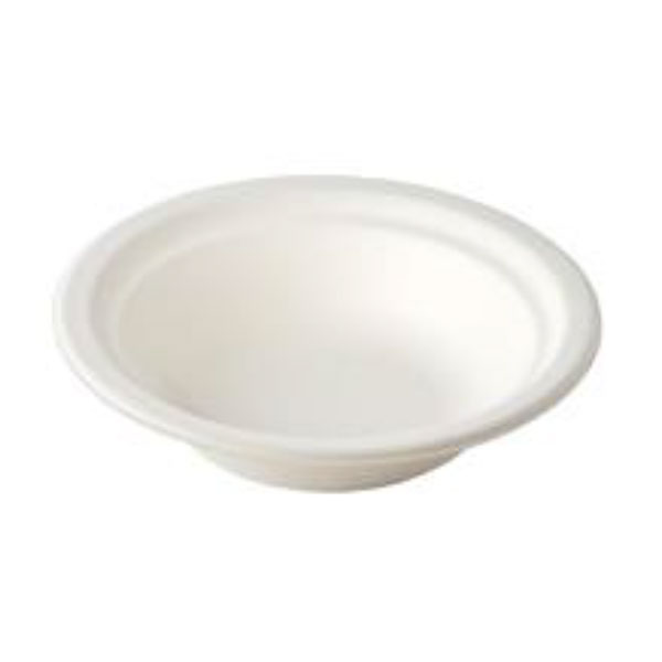 Piatto fondo bianco monouso in polpa di cellulosa ottenuta da canna da zucchero. Utilizzabile in forno a microonde e freezer. Impermeabile ad acqua e olio. Completamente compostabile in accordo allo standard UNI EN 13432. Altezza cm.4,3.
