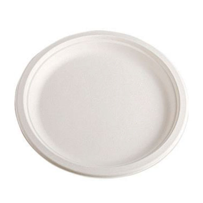 Piatto piano bianco monouso in polpa di cellulosa ottenuta da canna da zucchero. Può essere utilizzato in microonde e in freezer. Impermeabile all'acqua e all'olio. Completamente compostabile in accordo allo standard UNI EN 13432.