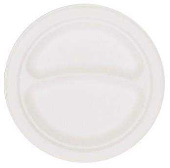 Piatti biscomparto in polpa di cellulosa di colore bianco, adatti al forno a microonde e al congelatore. Alta resistenza allolio e allacqua; rigidi e resistenti. Completamente compostabili.