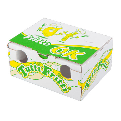 Scatola chiusa automontante per asporto di alimenti caldi e fritti. Comoda e con una grafica allegra.