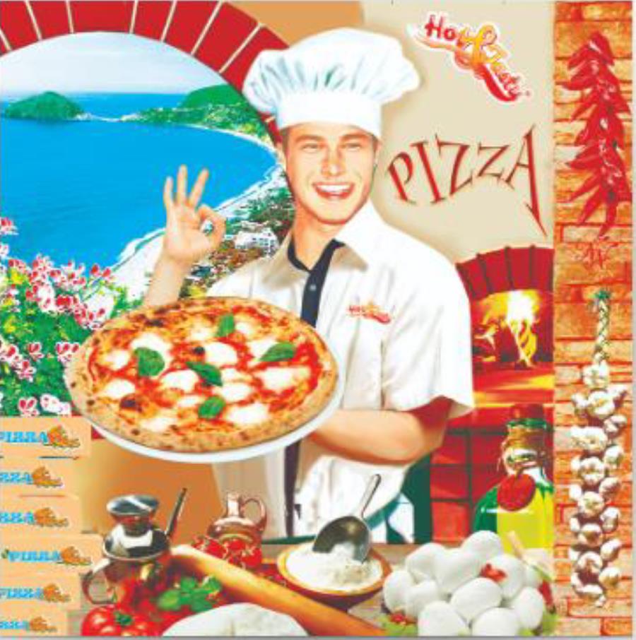 Scatola in cartone KBSV 222 E per pizza da asporto. Ottima qualità della carta sia negli strati a contatto con la pizza che in quello interno, ottima costruzione della scatola, grafica piacevole e luminosa.
