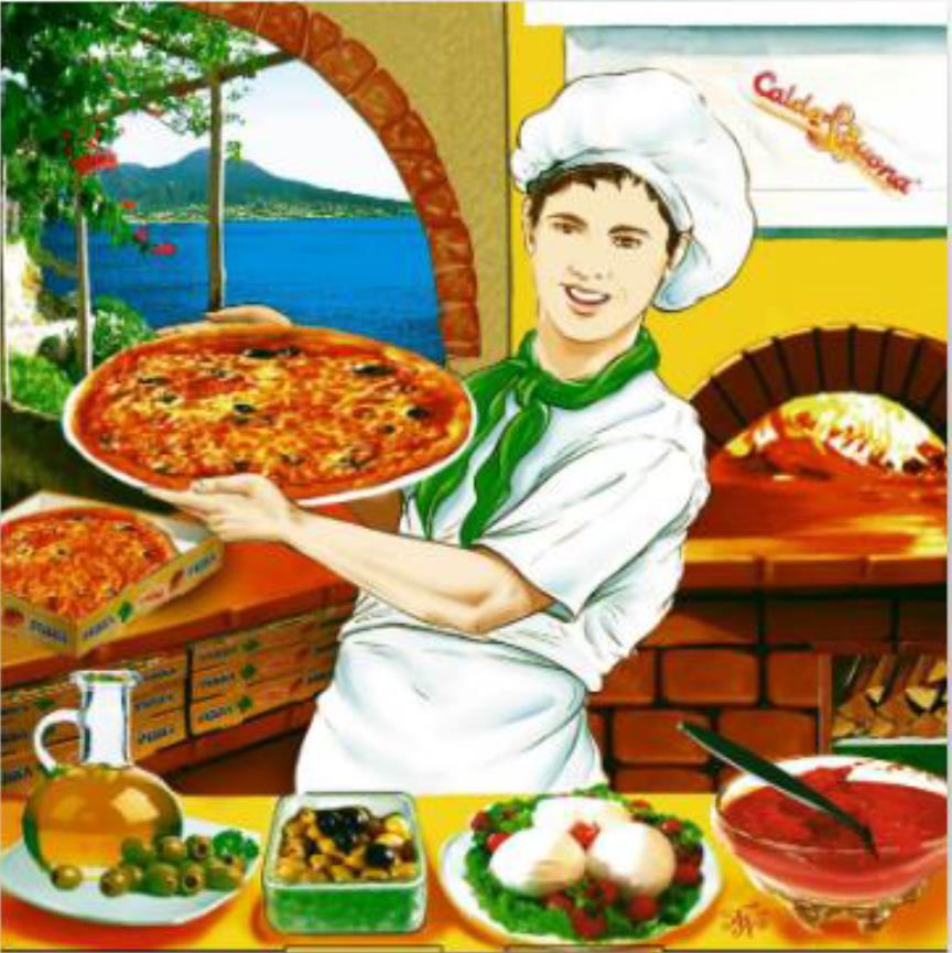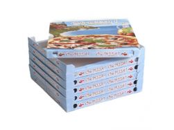 Scatola in cartone KBSV 222 E per pizza da asporto con immagine Vesuvio. Ottima qualità della carta sia negli strati a contatto con la pizza che in quello interno, ottima costruzione della scatola, grafica piacevole e luminosa.