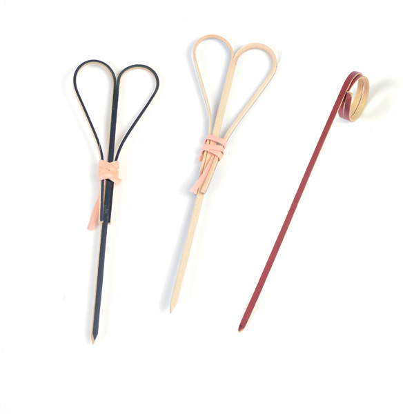 Spiedini in bamboo decorativi, completamente biodegradabili. Con decoro colorato a fiocco.