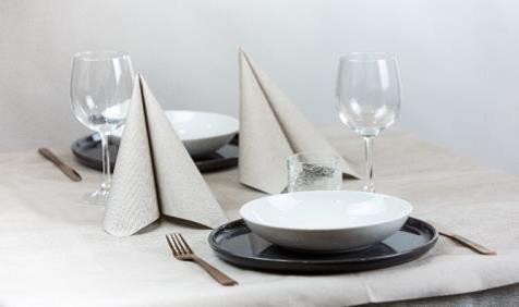 Tovaglie e tovaglioli in carta a secco di alta qualità e grammatura, materiale di derivazione naturale in cui le fibre di cellulosa sono fissate da un bagno di lattice per ottenere una maggiore resistenza alla trazione