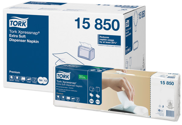 Tovaglioli piegati 1/2, certificati Ecolabel, per dispenser sistema N4. I tovaglioli bianchi monovelo per dispenser Tork Xpressnap® sono ideali per le strutture ad alta affluenza attente al costo in uso.
