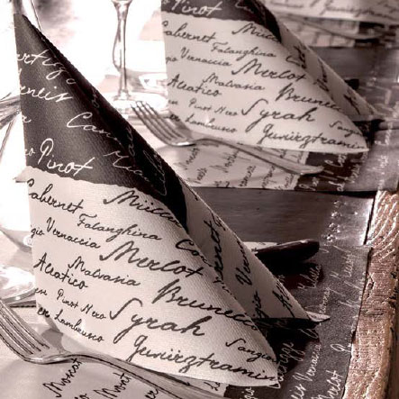 Tovagliolo in carta a secco fantasia nomi vini con cornice. Compostabile, con certificazione PEFC.