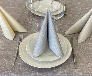 Tovaglie e tovaglioli in carta a secco di alta qualità e grammatura, materiale di derivazione naturale in cui le fibre di cellulosa sono fissate da un bagno di leganti vinilici per ottenere una maggiore resistenza alla trazione.