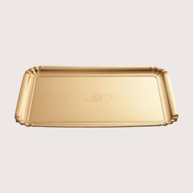 Imballo in termo a chiusura integrale. Prodotti rispondenti alle normative vigenti in materia di idoneità al contatto alimentare, completi di certificazione, scheda tecnica e tracciabilità. Cartone monolucido, film poliestere color oro brillante, bordo svoltato, retro bianco. Una confezione contiene circa 350 vassoi.