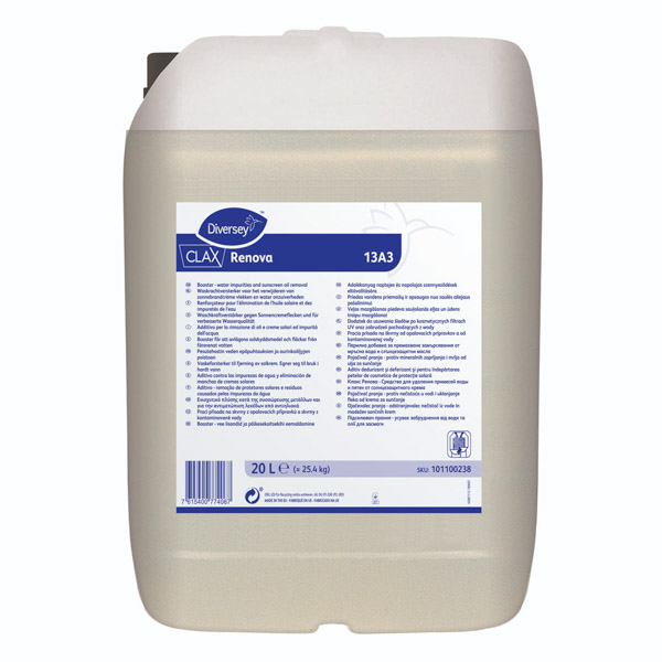 Additivo concentrato per la rimozione di oli, creme solari, cosmetici e per rimuovere le impurità dell'acqua. Previene le macchie gialle dovute a creme solari.