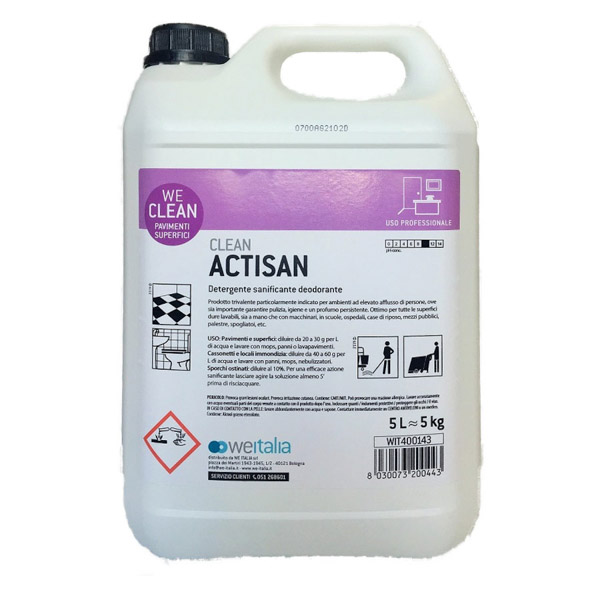 Detergente ad azione sanificante a base di sali quaternari di ammonio indicato per la pulizia e l'igiene di tutte le superfici dure, pavimenti, arredi, pareti, sanitari e attrezzature varie.