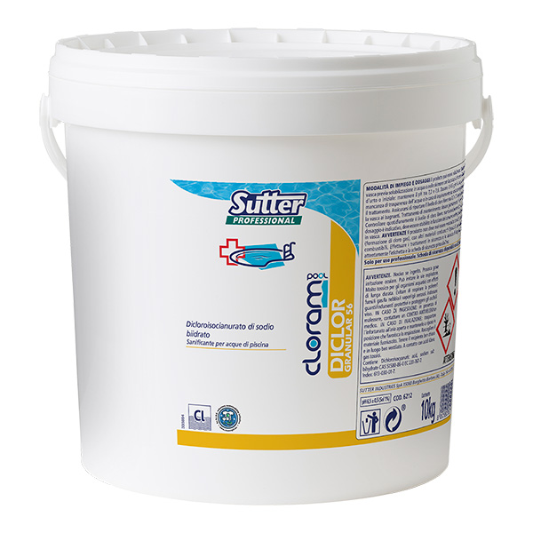 Sanificante per acque di piscina. Dicloroisocianurato sodico biidrato ad alta purezza che in soluzione libera acido ipocloroso e acido isocianurico, ai livelli minimi di 20-25 mg/l (20-25 g/m3), agisce da stabilizzante nei riguardi della decomposizione del cloro per lazione dei raggi ultravioletti. Prodotto granulare per la clorazione dell'acqua.