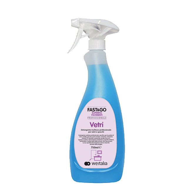 Detergente multiuso autoasciugante a base di solventi per vetri e specchi e superfici dure in genere. Pronto all'uso.