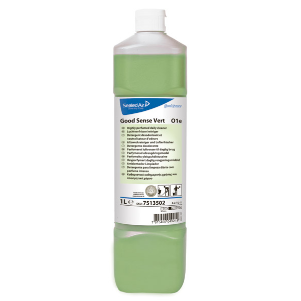 Detergente deodorante liquido. Adatto a tutti i tipi di superfici dure. Lascia nell'aria una fresca fragranza di mela verde. Tecnologia ONT.