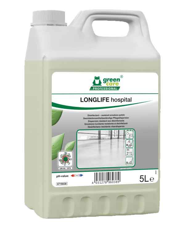 LONGLIFE hospital è ideale per la manutenzione di pavimentazioni resistenti all'acqua di strutture sanitarie come ospedali, studi medici, case di riposo e di cura, centri di riabilitazione, ecc. LONGLIFE hospital crea un film protettivo durevole. Lottima resistenza allalcol e agli altri disinfettanti consente unefficace protezione delle superfici anche nelle aree dove non è possibile evitare del tutto lo sgocciolamento di disinfettanti (ad es. aree dei dosatori). Il film protettivo rimarrà invariato anche dopo lessiccazione dei residui di prodotto sulle superfici.