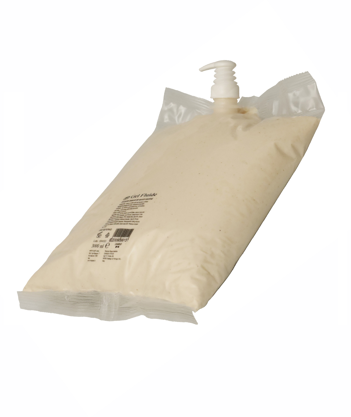 Ricarica Bag Volflex da Lt.3, dotata di erogatore "usa & getta", con pasta lavamani GEL FLUIDE, crema Lavamani in gel Bianca Fluida con abrasivo Minerale, ideale per sporchi industriali - pH 8,5.