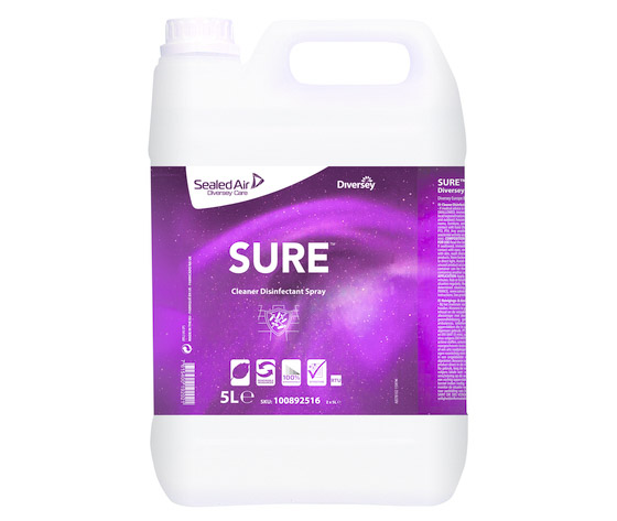 Detergente disinfettante pronto all’uso per la pulizia e l’igiene di tutte le superfici nelle aree di preparazione alimentare. Ad azione battericida e fungicida. Senza profumo né coloranti. SURE Cleaner Disinfectant Spray supera i test di attività virucida e fungicida con 5 minuti di tempo di contatto: Test EN1276 (attività battericida con sostanze interferenti); Test EN13697 (attività battericida con sostanze interferenti); Test EN1650 (attività fungicida con sostanze interferenti). Test EN14476+A1 (attività VIRUCIDA, virus A/H1N1). N. di Autorizzazione AMN LV/2014/SP01-10P.